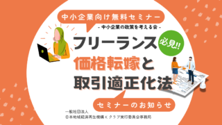 中小企業の政策を考える会 フリーランス必見!価格転嫁と取引適正化法セミナーのお知らせ 最近、フリーランスとして働く人が増えてきました。でも、その裏で取引や労働環境に関する問題も出てきています。そこで、新たに「フリーランス取引適正化法」が制定されました。新法のポイント「フリーランス取引適正化法」この法律は、フリーランスや仕事を... 2024.08.28 中小企業の政策を考える会